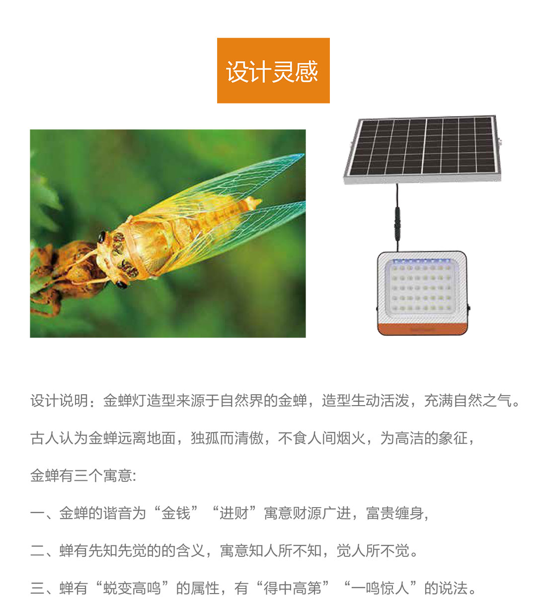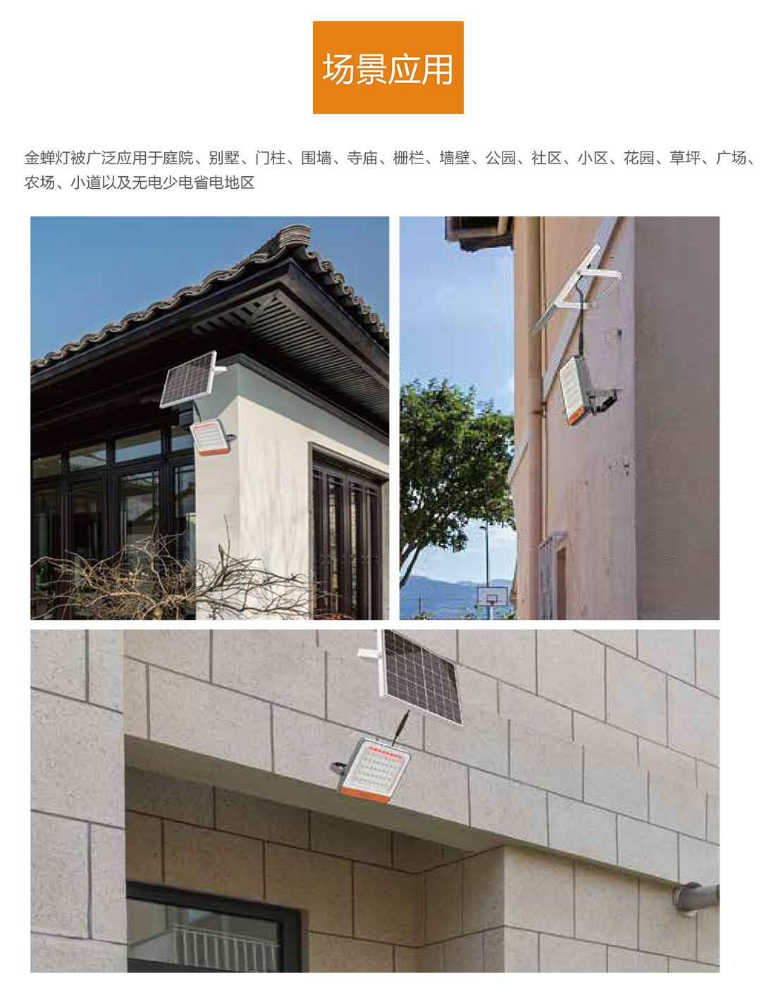 金蟬燈作為太陽能投光燈,被廣泛應(yīng)用于庭院、廣場、私家花園、別墅、寺廟、農(nóng)場、戶外廣告牌等場景。