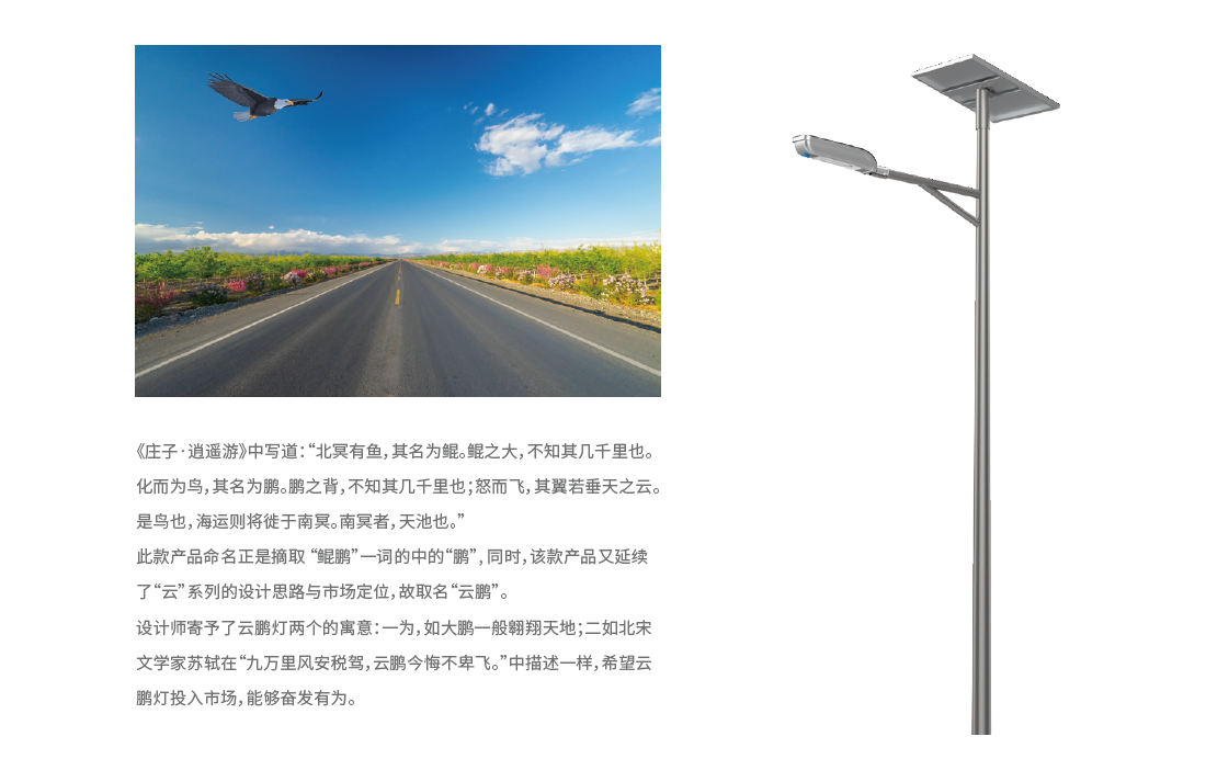 云鵬燈作為中大功率分體式太陽能路燈,被廣泛應用于新農村道路、鄉鎮道路、城郊車道等6-10米的安裝場景。